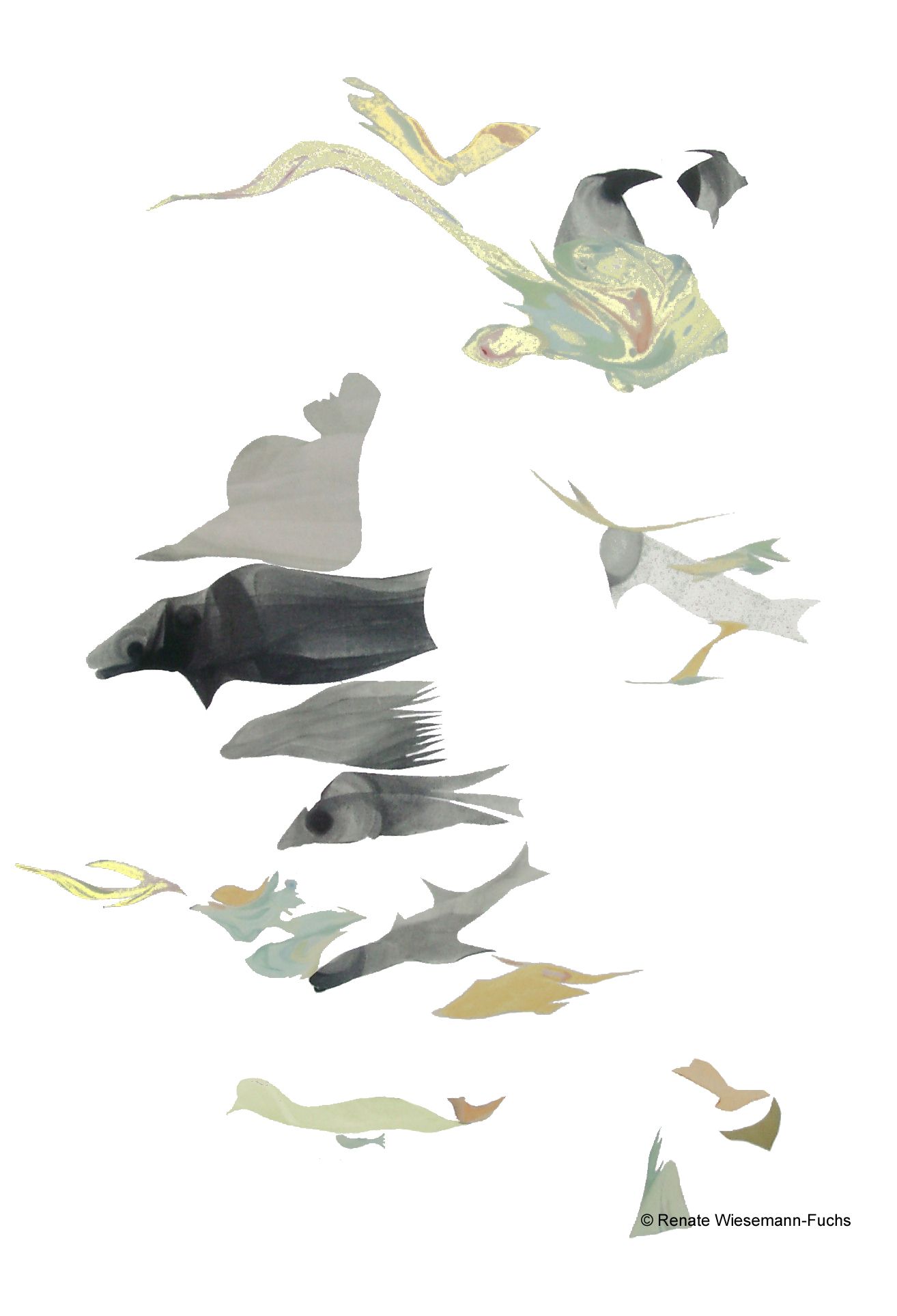 schlängelt sich - und löst sich in den Fischen. Eihuhn vor Blau