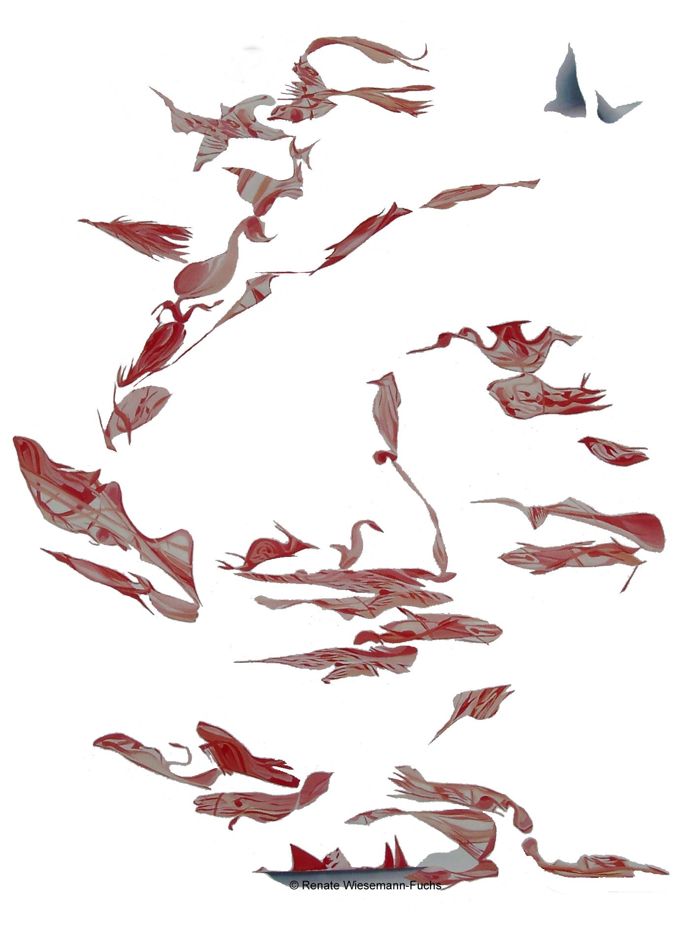 Rote Hexe-schwarze Hexe-Streit mit seltsamen Waffen: schneiden Fratzen, werfen sich Fetzen zu, schnurren durch Federvieh, fletschen, flatschen und quaken wie Frösche und Enten- den linken Teufel im Schlepptau.....-Nichts Ernstes?!- Spieltiere fürchten sich.-